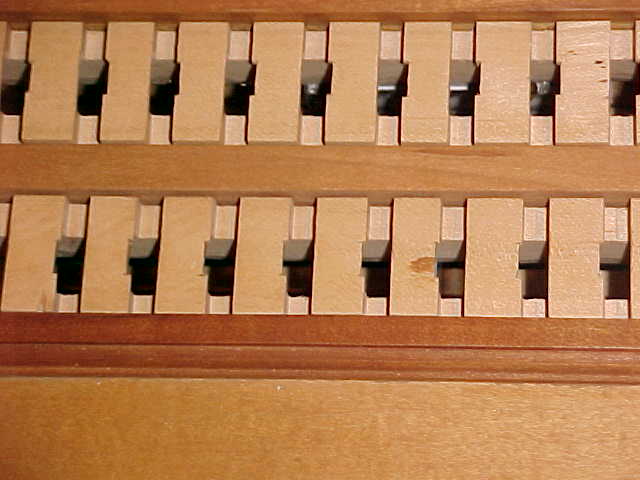 At this point (Feb, 2001) the voicing is not completed and a minor modification is still planned to replace the screws in the bottom that hold the key bed in place. And the buff stop still awaits it's 61 little pads of leather.