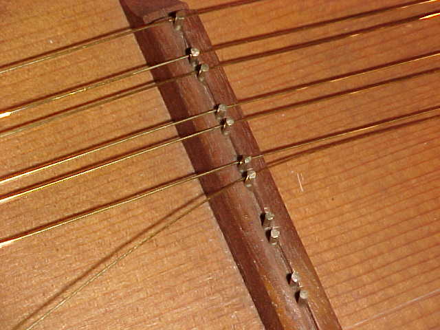 Making a string is not a particularly difficult task but does require a bit of concentration. First you measure out the proper amount of wire which I arrived at by experimentation. Ten inches to form the loop, ten to twenty inches to wrap around the wrest (tuning) pin and finally the exact measurement from tuning pin to hitch pin. After forming the loop and double wrap, the string is attached to the hitch pin, threaded over the bridge and nut pins then wrapped 10 to 20 times around the tuning pin and finally threaded through a hole in the pin. None of this is anywhere near as easy as it sounds. Several hazards make it a fairly demanding task. First of all, after forming the first ten loops, I had blisters on two fingers of each hand. I tried Band-Aids but they interfered with the my ability to make neat wrappings so I just ended up waiting a few days for the blisters to heal. Progress was pretty slow at first with only a dozen strings completed each week. Each string length had to be recalculated as the bridge to nut length was consistently shorter but as the gauge got thinner, the number of wraps around the tuning pin increased. I could have just added a foot or so to each string but that would have eventually required extra spools from Hubbard. The biggest limitation was that while winding the remaining wire around the tuning pin, the length had to be short enough for me to retain tension on the wire while holding only the end of the wire. Therefore the remaining string can't be any longer than my arm before winding the tuning pin. Then next hazard was the frustrating mishap of not maintaining tension while winding the pin. Easing the tension even slightly would often result in the partially wound wrap springing off the pin and becoming kinked and completely useless. About 10 to 12 strings ended up in the garbage for this very reason. The final and most serious hazard was the tendency of the neatly trimmed strings to become as sharp as needles so that when attaching the next string, my fingers were often punctured by the previous string ends. I occasionally had to stop assembling strings to wait for the bleeding to stop so that I wouldn't stain any of the wooden parts. But finally after six weeks and 122 strings, the job was complete. Well almost... After all the strings were installed, I tuned them up to an octave below standard tuning and left them there for a week to settle. After a call to Hendrik Broekman at Hubbard I tried pulling the tuning up 4 half tones at once. In the first 12 strings I broke 6. Back to making strings again. A week later everything was back to an octave low again. Then I returned to my original plan of a half tone every 2 - 3 days. That took another 2 weeks and we finally arrived at B - 493.9 tuning and it's been there ever since.